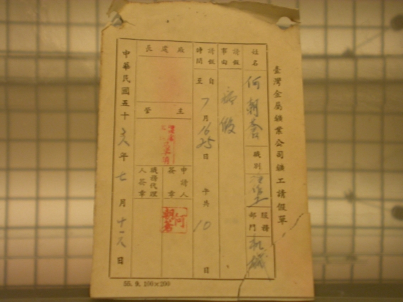 礦場工作除了安全的風險非常高,各種傷病情況也非常普遍,尤其礦工長期暴露在煙塵環境中,容易罹患塵肺症。礦工請假理由常以病假為多,請假單敘明姓名、職別、服務部門、事由、請假日期等,申請人、代理人簽章後,需經廳處長、主管簽核備查,最後一欄是請假日期。