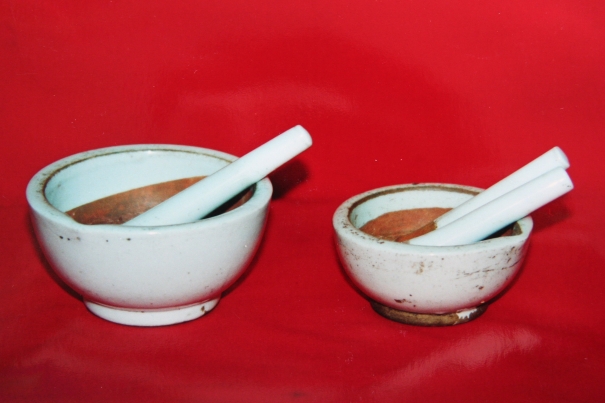研缽是磨碎固體的工具組,有盛裝固體的碗缽容器和用來磨壓的小杵。由陶瓷、金屬、玻璃或瑪瑙等材料製成。用於研磨顆粒或塊狀的藥料、顏料或原料等,使成為細粉。目前仍普遍運用於中藥房、醫院和研究機構等各相關工作中,但僅能小量磨製,除了金屬製的可以撞鎚研磨之外,其餘材料容易破損,使用時只能輕輕翻動滑磨。