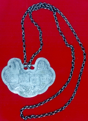 為護佑兒童的鎖形胸佩,一般多稱為「鎖片」,又因為常垂掛於胸前,故也可稱「胸佩」。胸佩的外形眾多,有圓形、八角形、磬形、花形、雲朵形、圓筒形,以及最常見的鎖形。鎖形胸佩,常見有銀片所製,稱為「銀鎖片」,若為金片所製,稱為「金鎖片」,亦有用錫片製成的。製作上常見兩面立體鼓面相合者,亦可單面或雙面雕花,有陽刻圖案或透雕作法的,講究者亦可銀片鑲嵌玉片的。鎖片上一般刻有吉祥花卉、蝴蝶、蝙蝠、福祿壽三仙等人物,而寫有「百家保富貴」、「百家寶鎖」者,意為百家百戶代代常保子孫富貴之寶鎖,故稱為「百家鎖」。