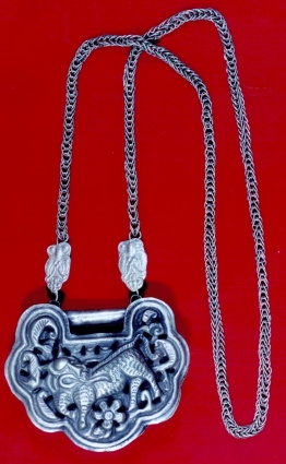別於項圈,掛在頸部有加墜子的的稱為「項鍊」。一般男女老少皆有配戴,而在幼兒出生滿月、作四月日、周歲等,親友或外家會送頭尾禮祝賀中,常有金飾或銀飾的項鍊,項鍊墜子圖案有的會採銀製仿古銅錢狀(刻有「太平通寶」之字樣);有的會以吉祥瑞壽,如十二生肖相連狀(鼠、牛、虎、兔、龍、蛇、馬、羊、猴、雞、狗、豬,以示適合各類本命生肖常保平安)、雙魚戲水有年年有餘之意、或是麒麟送子圖案,童子身騎麒麟,手中尚握一荷花,有象徵蓮生貴子、麒麟送子之意;有的則以各式辟邪吉祥寶物(如小鐘、寶刀、仙桃、令旗、官印、搖鈴、鯉魚、葫蘆、寶劍、杯子等);有的則是鎖片狀的墬子,上面刻有各種神仙人物、吉祥植物、祥瑞動物等,一般鎖片狀者多被稱為「金鎖片」或「銀鎖片」,請參「金鎖片」、「銀鎖片」條。