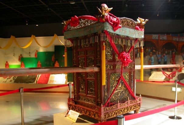 此花轎頂部似寶塔狀,四周刻有鳳凰、花卉等圖案,並且鑲有傳統愛情故事的玻璃畫,左右中間兩旁開有通風的小洞,轎子裏放有小椅子,前面有門可以進出,前門兩旁中間有方洞可讓兩支竹棍由此穿過,再由轎伕四人抬動。