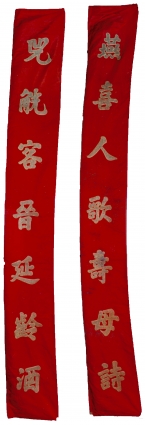 祝壽時所用的聯對,稱之「壽聯」,它展現漢民族的人文性,以及書法藝術性的一面。一般都是引用歷史或人物典故的詞句加以變化組合,主要是表示送禮者的祝福,祝賀壽星吉祥如意之意,例如「福如東海,壽比南山」之類;也有依照不同年壽而寫的,如六十大壽時則作「二回甲子春初度,舉國笙歌醉太平」、九十大壽則作「瑤池果熟三千歲,海屋籌天九十春」;也有依男女性別不同而以椿(意寓父親、男性)、萱(意寓母親、女性)表現,如男壽時為「椿樹千尋碧,蟠桃幾度紅」或「寶樹靈椿三千甲子,龍眉華頂九十春光」,祝賀女壽則有「笑逐顏開桃花擎實,年徵耳順萱草忘憂」;也可因職業、工作區別而書寫的,如文官體系的為「公與夫人蔚成國瑞,子為儒吏振此家聲」、軍界通用的有「道德文章大壽考,功名富貴真將軍」。一般市面上都有實用的對聯文書可供參考,較有文采的就可自己創作聯對,可以依祝壽者與壽星的關係和交情友誼的深淺狀況,自己創作出不同於既有的壽聯,此對壽星較具特殊意義,也有因撰寫人的書法功力之深淺,而增添欣賞壽聯墨寶的樂趣。