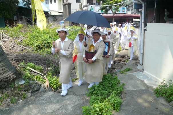 所謂孝杖又稱「哭杖」或「哀杖」。喪禮出殯發引時,會由孝男捧著魂斗,以紅色圓形木斗中,置放亡者的魂帛、上插兩炷香、孝杖以及五穀丁錢,並由另一位家屬持黑傘為亡魂遮避陽氣。每一位孝男及長孫均有一枝孝杖,原則上每著喪服時,即應手持孝杖,至除服時才燒化。父喪時用竹杖,有節的竹枝上繫五色麻布,表示「父愛有節」;母喪時,以銅杖或苦苓杖,有表示「同心」、「母愛無限」之意。現代人也有母喪取無節竹枝做為孝杖的。代表孝男的孝杖頂端是紅布上綁上麻布,代表長孫的孝杖是紅布上綁上苧布;但有的地方是代表孝男者,自外而內綁上麻、苧、藍、黃、紅五色布,代表長孫者自外而內綁上紅、藍、黃、紅四色布。
