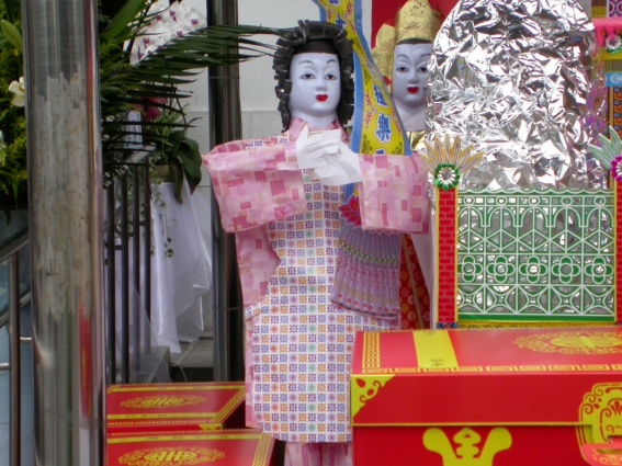 玉女的造型為立姿,身穿古代黃色上衣,紅色長裙,頭戴銀冠,雙手合抱,持一靈幡,幡上寫有「玉女後隨極樂天」。等到出殯作功德結束後,金童玉女紙像與靈厝一起火化。