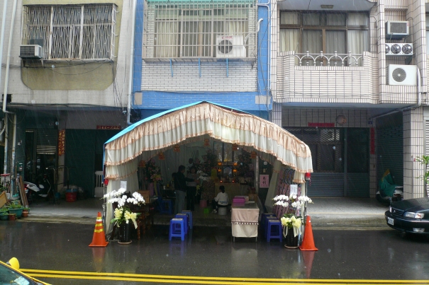 喪家在亡者過世後,需於大門上張貼告示,以白紙黑字寫著「嚴制」(父死時用)、「慈制」(母死時用)或「喪中」(指晚輩去世長輩尚在者使用)等字樣,告知左鄰右舍家中有喪事。以前日據時期,因臺灣曾受到日本人的影響,而有在喪家門口寫「忌中」,現代已較少人如此。而喪家門口紅色春聯上面要斜貼白紙條,以示轉喜為喪。昔日並會在喪家門口上方懸掛一張長方形的白布條,寫上亡者的姓名、生卒年月日,以及居喪者的姓名,及其喪禮服制,藉以示喪,稱為「白屏式」或「門牌式」。