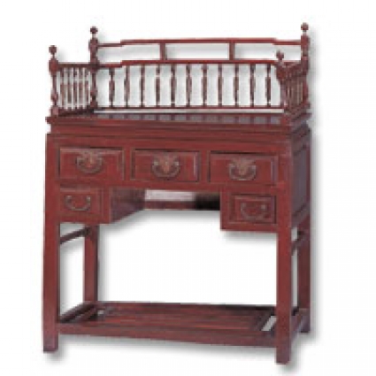 桌子的基本形式與書桌相近,共有五格抽屜,上層三抽屜一字平列,白銅配件蝶形鎖孔葉面帶拉手,下兩側抽屜較窄只設拉手;而管腳的腳踏和側面彎棖作工結構均按比例合理美觀。不同的是桌面以上有三面以鏇木構成的桌圍短柵,保持隱密和安全。桌圍的短柱和轉角主柱均以車床鏇車而成,其年代應已晚至日據時代。 帳桌是帳房的主要家具,只見於大戶人家或商宦,以供銀錢佃租往來收支之用,桌面擺設筆硯算盤以供掌櫃或執事先生記錄往來情形,格屜或設有暗門存放帳冊銀簿字據。
