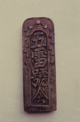 五雷令牌通常用於特別的道教儀式,如醮典科儀時,高功道士行科演法,即執之召請萬靈神將降臨,護衛道壇、增強法力,並達到驅逐妖魔邪祟的目的。五雷令之形式為上圓下方的長形令牌,正、反兩面常有三清諱、五雷號令、總召萬靈字樣與官將像。而令牌側緣則刻有二十八星宿名諱等,其雲篆文字及圖像有平常人即可辨識的正體字,也具有象徵號令、法力之所出的符令複文,專業人士始能辨識,故為道壇上必備的法器;平常安置壇上,行法時依訣取用,通常用於發表科儀中的淨壇儀式,以及敕水禁壇科儀中的召四靈儀式。