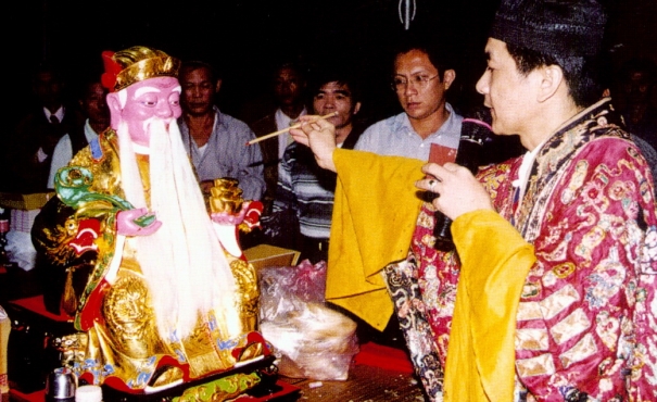 其中用於從事神像開光支用的硃筆,在儀式中除了沾硃砂之外,還要同時沾白雄雞的雞冠血,以取其雄雞司辰的陽氣之意,開光儀式中所使用的硃筆,也都被慎重地供奉在神像之側。就因為硃筆具有神聖法物之地位,也被視為具有辟邪功能之器物,民間將其和符水罐繫在一起,懸掛在門楣上方,俗信可以阻擋鬼魅邪祟入侵住宅,鹿港地區多見其習俗。