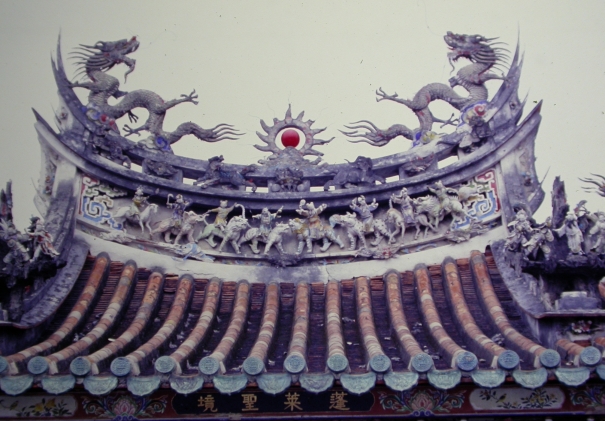 雙龍搶珠是臺灣廟宇常見的屋頂辟邪裝飾,通常位於屋頂正脊之上,由中央的火珠和兩側的龍所組成,龍頭朝向中央的火珠,形成兩條龍欲搶奪一顆龍珠的形式。臺灣廟宇的雙龍搶珠辟邪裝飾,在清末以前多作龍尾高翹的造型,乃是由較早的龍頭魚身之蚩尾演化而來,龍身的兩隻後肢也分別懸空伸向左右兩側。晚近的雙龍逐漸降低龍尾的高度,而成為左右橫向的行龍形式,但它的功能仍與蚩尾相同,主要在借重雲從龍、龍司降雨的信仰,以水來辟火煞。 清末以前雙龍搶珠的裝飾多以剪黏方式製作,是廟宇中體量最大的剪黏裝飾。製作時匠師要先在屋脊之上安置金屬支架,然後在支架上以灰泥塑出龍形,隨後再以各色的陶瓷片鑲嵌在龍身之上。戰後臺灣的的剪黏作法以玻璃片取代傳統陶瓷片,近代匠師則多以預先燒製的陶瓷片組件來施作剪黏,直到晚近古蹟修復講究恢復傳統工法,才有廟宇再度採用傳統剪黏方式製作。