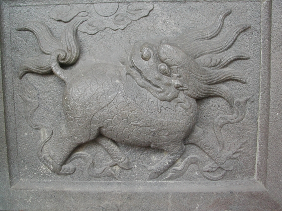 麒麟是古代神話中的神獸,也是重要的祥瑞象徵,其造型通常作龍頭、馬身,身上擁有和龍一樣的鱗片,雄者為麒,雌者為麟。寺廟建築中的麒麟裝飾,常見的有位於神龕背後的彩繪麒麟,多為主祀福德正神的廟宇;或是以浮雕石雕的方式,安置在前檐牆或廊牆的裙堵部位,因此廟宇前殿牆面的石雕裙堵又被稱為麒麟堵。 此外,也有少數廟宇將其置於欄杆柱頭者。廟宇設置立體的石麒麟有守護和求吉祥的雙重意義,多成對置於廟宇大門之外,或是安置在大門的門柱之外,以之代替了傳統抱鼓石的位置,是臺灣廟宇中較為少見的神獸類石雕圓雕作品。