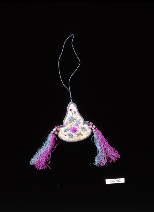 煙袋類似小荷包,繫綁在煙桿上,是煙桿的配件。袋子小巧精緻,布質,沿口穿繩線,抽緊繩口,煙絲就不會漏出。因為早期也有許多仕女吸煙,有些煙袋作工細緻,上面花鳥、仕女圖案,可好好細賞把玩。