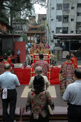 民間俗稱的三界公,即三官大帝,亦即「上元一品九氣賜福天官洞靈元陽紫微大帝」(天官)、「中元二品七氣赦罪地官洞齋元虛大帝」(地官)和「下元三品五氣解厄水官洞陰元光大帝」(水官)等三位,民間俗稱三界公,神格相當尊貴,常代表天公接受信眾的祈求賜福、赦罪與解厄等。而祭祀三官大帝的日子分別是上元節(正月十五)、中元節(七月十五)和下元節(十月十五),合稱為「三元節」。所以中元節時為地官大帝聖誕,故往往農曆的七月十五日要舉行「慶讚中元」的祭典,民間各宮廟多於是日結三官壇(俗稱三界壇),分頂、下桌,亦如拜天公般,頂桌上置三座三界公的燈座,供有六齋或十二齋的素桌,包括紅圓、紅牽、紅麵龜、壽麵、水果、餅乾、天公金、高錢、一對帶頭尾的甘蔗等,下桌為五牲、水果等的葷桌,備辦豐盛的供品來祭拜三界公。
