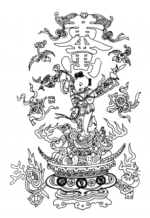 五路財神是從四方而來,貼祈財斗方箋就是要請財神看到、眷顧到,所以很用心的設計、很用心的剪成吉祥花字。 吉祥花字是用漢字特有的部首、偏旁互相採借、連接在一起,遠看像花團錦簇,近看畫中有字、筆筆相連、字字吉祥,頗得巧思。另外還有連錢文,並非以文字構成,取外圓內方銅錢紋樣,錢錢錯疊,稱為連錢文,多見於傳統建築的青瓦花窗。