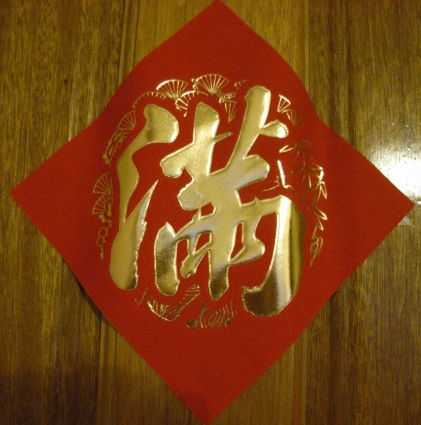 在春節期間處處可以看到民間運用吉祥文字來祈福納祥。寫著「滿」字的春條,貼在米桶、水缸…等儲藏器物上,表達了人們期盼且追求豐盈且不虞匱乏的富裕生活。