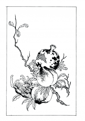 傳說中仙桃三千年結一次果,因此桃子成為長壽的象徵,佛手因「佛」與「福」諧音,象徵幸福,石榴因子多而象徵多男子。將這三種圖像結合,組成祝賀多子多壽多福氣的吉祥圖案。