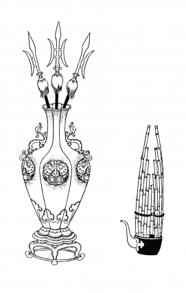 花瓶中插著三支戟,旁邊還有磬和笙。取磬、瓶、笙、三戟的諧音祝賀人仕途高昇、事業順遂。