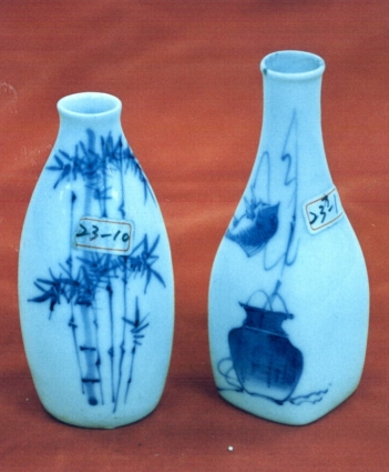 酒壺是比較精巧的器具,從日據時期開始有特別的出品。日本人習慣於飲用清酒前先將酒溫熱,因此出現瓷質的酒壺,飲酒時將酒倒入酒壺,壺外置溫水以溫酒,壺的造型考究,有日本風味,壺底有字款。以燒製酒甕聞名的苗栗酒廠,從傳統中突破創新,設計新款式造型。另外有一部份的酒壺可能是作為祭祀禮器用途。除了瓷酒壺之外,有玻璃製成的斟酒壺,主要使用於富裕家庭或營業場所,有的形狀類似花瓶,有長窄的直頸,口部開口小敞,一端突出尖口狀,便於酒流出來;圓弧輪廓的斜肩,腹部輪廓類似花瓶,壺底有足座;口部和腹部外表的裝飾,有時以深顏色玻璃形成優美花紋,或者是淺淺浮起的透明花卉紋。