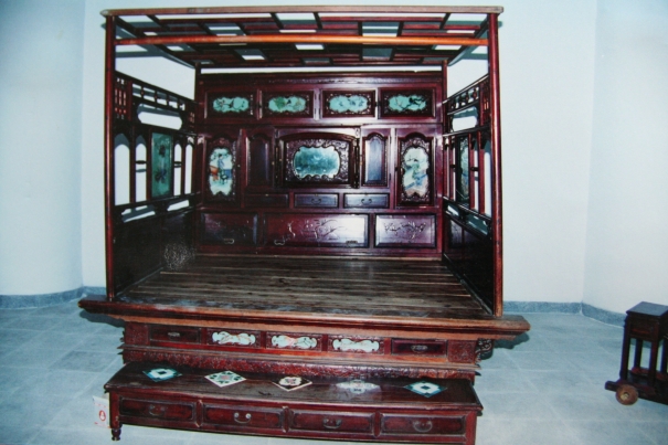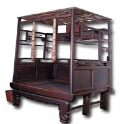 臺式眠床的基本形式三面圍架可各別分離,其左右兩面有立柱,略往內傾,與頂棚聯結,後面一片只有短圍板,兩端以望柱收尾。而蚊帳直接罩住頂棚再順著圍架垂下;如果圍架是垂直的話,則帳子不能密貼,是一種從生活體驗發展出來聰明的作法。床裡側的上方有多格架倒掛,以存藏細軟珍玩。床的前沿是一根粗厚的直材,連接雕花牙條和裹腳,下附小托泥板。如果從側面觀察,可以看到底部支架的組合方法,是由兩床底架併聯而成,共有八腳。