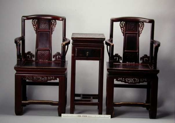 太師椅是臺灣民宅中位居祖先廳裡最重要和尊貴的座椅。太師椅又被稱為交椅或金交椅,即指擺設於中堂顯著位置,位居於第一的意思;此意承襲宋元,通行於中國東南沿海,專指有靠背帶扶手的「轎」式椅,轎與交音相同,雖不具交椅的椅腳可以折疊的功能,但其重要性絲毫不減,是一般所稱南官帽椅,搭腦和扶手均不出頭,含蓄而且穩重。在臺灣農家詩書耕讀,恪禮慎節,非官紳之家則無幕友師爺在座也就不敢擅為太師椅了,而叫做學士椅,含有鼓勵子弟參加鄉試科舉,求取仕宦功名;退而求其次,厝內無人讀書則稱為公媽椅,乃取公媽廳內的椅子之意。 臺灣早期太師椅的典型是全身使用木材,搭腦兩端垂直下彎;扶手鵝脖也是垂直另安,下端略收入三分後帶回紋卷牙盤,加強與座面的結構。靠背板三段攢框打槽裝板,上段平鑲素板嵌雕福字夔龍浮紋,中段落堂作地墨繪富貴花卉,下段鑲落堂凸板凹雕蝶紋並鎪出卷草紋亮腳;整個靠背板順著人體背部線條形成優美的S形弧線,與中段略往外彎的搭腦、扶手相呼應,做工嚴謹考究,是臺式太師椅共有的特色。靠背板上端並有卷草透雕角牙,比一般所見略大,打箔痕跡仍在;扶手下的聯幫棍,臺灣司傅稱為牛角腿,用大腸節的扁形曲木為飾。屜面以下有高束腰,冰盤沿下的束腰俗稱杆仔線,髹以朱漆和靠背板的鑲板同色處理,束腰無托腮直接和牙條相連,即兩上的作法,牙條稱為櫺水,一面做透雕纏枝卷草帶線腳,與靠背角牙形成前後視覺的焦點。 方形腿足用料相當碩壯,下端有大馬蹄,帶線腳,加重下部的分量,形象穩重且無呆滯之感,是臺灣民間視家具為傳家物而加強用料的結果。腿足之間管腳棖,稱為落地槻,前後較低,兩側較高,也是臺式家具的基本形式,前面腳踏橫槻下加牙條托住,則是比較考究的做法。 從太師椅的製作形制,可以見到臺灣早期坐椅經長期發展結果,已將漳泉的風格融合並逐步修正調整而成為臺式特有的作法和樣式,且自成穩定的特色風格。 太師椅通常是成對的與一方几搭配,成一几兩椅、二几四椅、四几八椅、六几十二椅、八几十六椅的組合。常見之方几有束腰,中有抽屜,腿足打窪線,造形與椅同,下有條木組成擱板腳踏替代管腳棖,亦是臺式高几的基本形式,是晚清發展出來的風格,比例完美而且適用。 太師椅是祖先廳、公婆廳的主要坐具,代表入座者的地位和輩份均較尊貴。因椅面甚高,長者入座時有腳踏椅輔助,晚輩不可擅坐;坐時姿態亦不偏不倚,更不可交足疊膝,必須正襟危坐以達之於禮。
