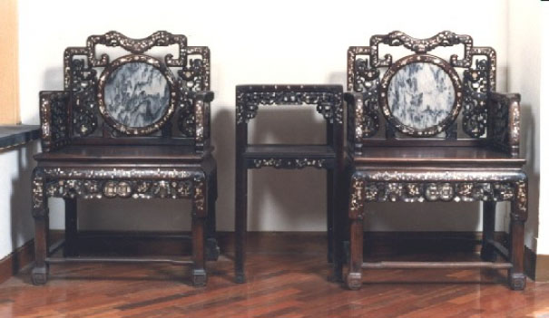 清代廣式的太師椅作工奢華,搭腦似如意雲頭,靠背由圓形大理雲石鑲成,左右雙螭抱柱;座面平整,下有束腰,腿部彭牙垂直落地,有拐子腳帶小旋眼,足部如馬蹄外翻帶回紋。足間橫如羅鍋棖,其角度較小轉彎方硬。椅面前緣有雕花牙條,中間以雙錢為飾,與靠背圓形雲石相呼應,甚為醒目,是裝飾的焦點。