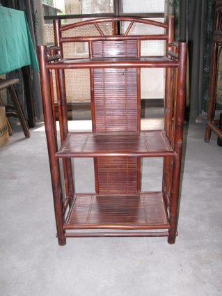 這種竹書架形式極似木製架格非常像,其功能並非只用來放置書籍。最基本的構成是竹管四足,將上下分割成若干層,格板由兩至三支圓竹對錯細剖後攤開舖平,串聯成面,竹青在上,板面自然光滑,用以置物。在每層的後面、左右兩側設欄杆,除了安全或美觀,也用以增加書架的堅固牢靠。