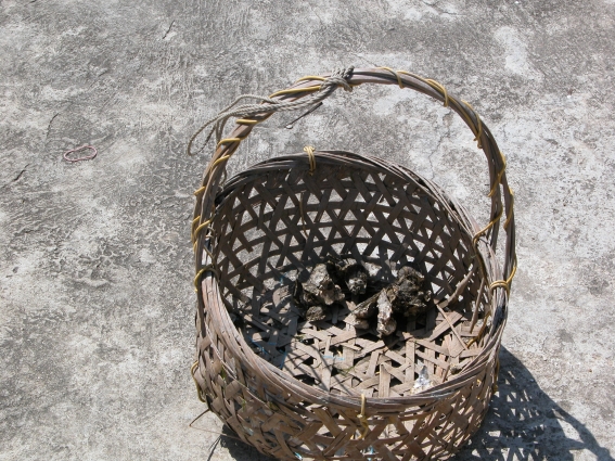 是用來裝蠔的籃子,金門人用來盛裝抖動來篩除沾在蠔上的土。蠔籃是以削成約二公分寬的薄竹片,以六角形編法編成的圓形籃子,直徑約六十公分、高約二十公分,籃緣相對的位置各加上兩個弧形提耳。 通常鏟下的蠔放入蠔籃後,會在附近的小水池,連籃帶蠔地在水(海水)中抖動清洗後才擔回家。一些破殼的蠔須先剝殼處理,至於蠔殼完整不破且較大的(稱作蠔匍),可以將之置於蠔籃內,存放在較高的蠔坪中,待小潮的幾天較為空閒時,再擔回家處理。