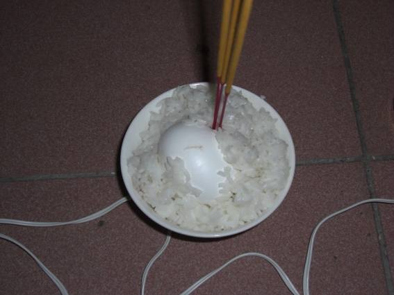 喪葬儀式中,用一空罐子在吟墘(大廳和天井之間的通道)下煮白米和雞蛋,然後在白米飯上置一粒熟雞蛋,飯下墊一塊瓦片,一起安置在死者的頭部上方,俾便插香,且要不斷地焚燒「白錢」(冥楮的一種)。據言死者甫過世,對彼方陌生的環境渾然不知,燒白錢的用意乃讓死者在陰間找人帶路之用。枕頭飯及其下方的瓦片,在死者入殮以後,應將之一起丟棄,須注意不可將瓦片打破。傳說此瓦片為死者在陰間的住宅,所以處理時最好擺放在陰暗隱蔽之地。