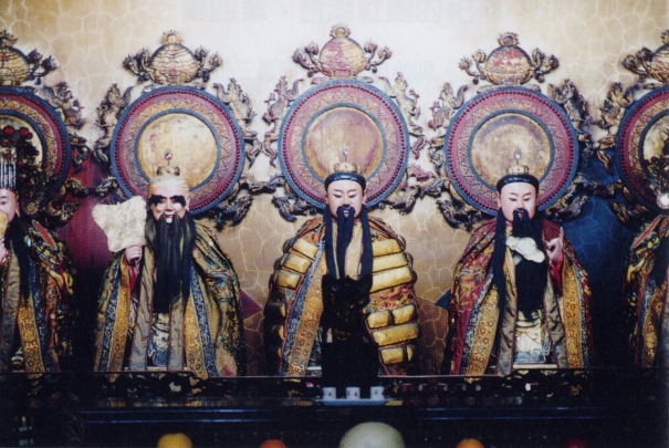 三清為玉清元始天尊、上清靈寶天尊、太清道德天尊,為道教神譜上的最高神祇,道教教義說一?化三清,即為宇宙創化生成之象。三清像通常以三位一組的形式出現,以元始天尊居中位、靈寶天尊居左位、道德天尊居右位。在道教結壇時,懸掛於內壇最前方,象徵三清宮。元始天尊像作右手虛拈、左手虛捧,象徵天地尚未形、渾沌成的無極狀態。上清靈寶天尊,位居元始天尊之左,其像作右手虛拈,左手捧陰陽境,象徵從無極狀態衍生太極。太清道德天尊(為老子信仰,單獨奉祀即稱為「太上老君」),位居元始天尊之右,其像作左手虛拈,右手拿一把畫有陰陽鏡的扇子,象徵由太極分化出來的陰陽兩儀。