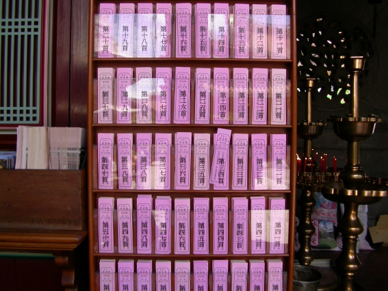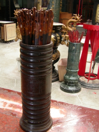 籤,多為竹製,呈長條形,籤頭多刻成葫蘆或其他形狀,其上並刻有干支或號碼,籤數必須與籤詩相符。籤存放於籤筒中,分置於供桌兩側,供信徒抽取。抽籤前需先將所問之事告知神明,並擲筶,若為聖筶即可抽籤,抽籤後尚須問神明所抽之籤是否正確,再擲筶,若為聖筶就可依籤頭上的號碼去取籤詩,若非聖筶則需重新抽籤。籤詩,以紙片製成,多掛在廟門兩側的木架上或置於木櫃中。籤詩,一般為運籤,多以七言四句寫成,籤詩的內容或為歷史故事、或為民間傳說,皆有其特殊的意涵,如對籤詩中的詞語不甚了解,可翻閱廟中解籤的書或請廟祝幫忙解籤。籤筒,指存放籤枝的容器,多為木製,形狀有圓形、六角形或八角形等。籤筒高度視籤枝長度而定,一般為籤枝高度的三分之二。