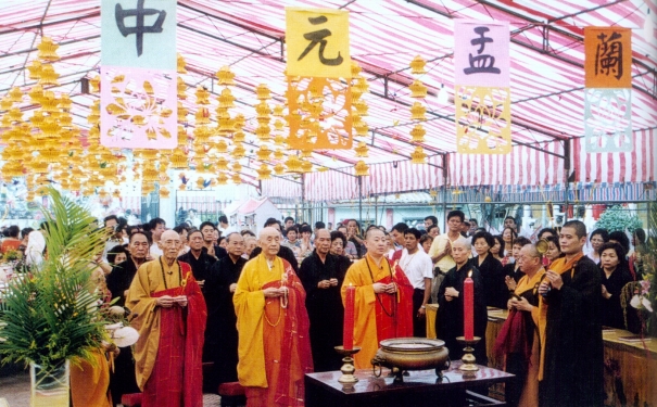 下午法師登座,禮敬法鐘、奉旨、淨瓶及行佛教的超度施食儀,有《蒙山施食》、或是《大甘露門施食要集》、《瑜珈焰口施食要集》,希望吉祥會啟,甘露門開,孤魂佛子降臨來,聞法赴香齋,永脫輪迴幽暗。後行施食「散擲十方」,許多信眾則圍在壇前伸出雙手準備接住法師所拋灑出來的豐盛供品(佛手、錢幣、花朵、水果、餅乾、泡麵、福壽米、福壽糕、糖果等)。