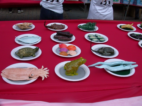 由肉類所擺設起來較新奇可欣賞民間廚師技藝的牲禮桌,稱為「看牲」,例如以肉類、蔬菜、水果、豬油網等共同製作而成,各種素材製作成的濟公,身上再以豬油網當成濟公活佛身上的袈裟;或是將豬油網裝飾成漁夫灑網捕魚狀,魷魚做斗笠、長年菜當長褲、甘蔗當作竹筏;豬肚擺設成兔子狀;而燻雞可擺設成一百零八位的宋江陣,頭戴斗笠,手持兵器。成千上萬的鯧魚可被擺設成一條蜿蜒的巨龍,無數的烏魚子擺成巨鳳,許多肉類則可擺設成有無數珍奇異獸的肉山,這常見於大型的普度或建醮普度場合上。