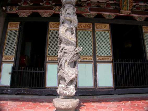 臺灣寺廟建築風格傳自閩粵地區,尤其裝飾上反映了信仰文化的企求與想像。龍是神靈瑞獸,可以為諸神的護衛,也可以滿足人們對絕對崇高的神秘力量的崇拜,所以寺廟建築的龍柱常是重要石雕匠師全力以赴的作品。 龍柱的形式在不同時期表現了不同的鑑賞風格。比如一柱一龍式,龍身盤柱一圈,尾在上,頭在下,昂首張口,龍爪握珠,有從天而降之氣勢。其次是一柱雙龍的天翻地覆式,雙龍上下對望,交互纏繞,有扭曲不安的動態感。近年則以繁瑣取勝,視覺上要求熱鬧效果,層層透雕,到了繁不勝繁的九龍盤柱地步。為了不單調,在龍身周圍添加鯉魚躍龍門等水族類題材,或各種描寫忠孝節義的「人物帶騎」等,使得龍柱達到炫目的效果。 從整體風格看,早期作品造形雄渾,線條粗獷,如臺南開基天后宮之龍柱。中期造形矯健,線條流暢,如鹿港龍山寺、彰化孔廟、淡水鄞山寺、宜蘭昭應宮、新莊廣福宮、松山慈佑宮之龍柱。晚期到今日的龍柱則喧鬧異常,主副模糊,重視雕工而失其意境了。