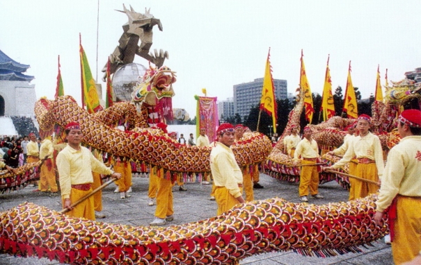 中國自古以來,認為龍是吉祥之物,能興雲佈雨,廣澤萬物,降福迎祥。黃帝以降,歷代帝王以龍做為尊貴之象徵,是龍的化身,故中國人自稱龍的傳人。龍的具體形象是多種動物的形體組合想像,龍有九似:頭似牛、嘴似驢、眼似蝦、角似鹿、耳似象、鱗似魚、鬍似人、腹似蛇、足似鳳。早期臺灣的民間畫工畫龍九法口訣:「一畫鹿角二蝦目,三畫狗鼻四牛嘴,五畫獅鬃六魚鱗,七畫蛇身八火炎,九畫雞胸。」 舞龍臺語「弄龍」,在高亢明亮又雄渾的鑼鼓節奏中,指揮龍陣操演。常見的步法陣式:一是「龍形八步」,以S型小跑步的出場式;二是「祥龍獻瑞」,長龍圍繞一圈,龍珠及龍頭在中間,行三叩首禮的行禮式;三是「龍尾穿龍」,由龍首及龍尾通過龍的中段身;四是「金龍擺尾」、「金龍跨尾」,延續上一動作,以反方向再繞一圈;五是「雙環迴轉」,成一個「8」字型,前後追趕;六是「金龍翻騰」,快跑交叉繞圈。以及睡龍、直行、金龍纏身等團隊動作,為使龍行順暢,需要有高度的合作精神。 舞龍用的龍身構造分龍首、龍身及龍尾三大部份,加龍珠一顆,做為隊形變換的引導。長度大小不一,龍身大約是九節到十五節,有些則長達五十多節。早期龍陣由寺廟組織時,龍身的節數都是單數,因習慣舞雙龍,兩條單節身的龍相加自然成為吉祥的雙數,今天的舞龍龍身已少講究節數。