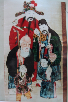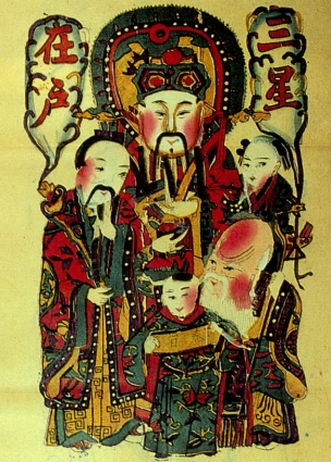 「三星在戶」,意思是福、祿、壽三星拱照之家。福祿壽三星起源於遠古的星辰自然崇拜。古人按照自己的意願,賦予他們非凡的神性和獨特的人格魅力,是民間崇拜的神仙人物,分別代表福運、官祿、長壽,福祿壽三星為三位一體不可分的民間吉祥文化的核心,代表著人們對美好幸福生活的嚮往。舊時人們喜在堂中懸掛福祿壽三星圖,象徵「三星在戶」的吉祥,有所謂「三星在戶,福壽綿長」的說法。