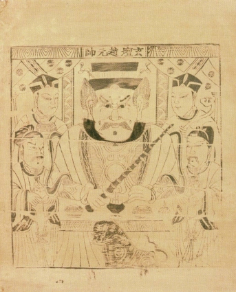 武財神趙公明又稱趙公元帥,他原是道教的護法神之一。武將打扮,頂盔披甲,著戰袍,墨面濃鬚,右手執鐵鞭,左手托元寶,身跨黑虎,威風凜凜,也有端坐於地上的形象。神像周圍還繪有金銀珠寶、聚寶盆等,頗有財源滾滾的氣象。至今,祭祀財神,仍多以趙公元帥為主。民間也有將趙公明及四位部下招寶天尊蕭升、納珍天尊曹寶、招財使者陳九公、利市仙官姚少司合稱為「五路財神」,並將其一併祭祀。