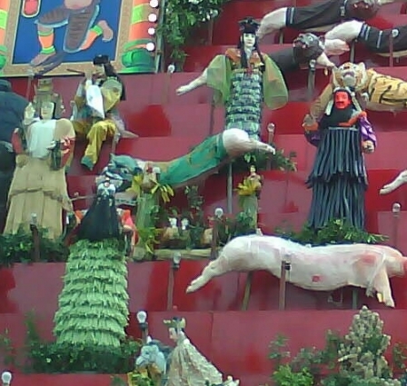 由肉類所擺設起來較新奇可欣賞民間廚師技藝的牲禮桌,稱為「看牲」,例如以肉類、蔬菜、水果、豬油網等共同製作而成,各種素材製作成的濟公,身上再以豬油網當成濟公活佛身上的袈裟;或是將豬油網裝飾成漁夫灑網捕魚狀,魷魚做斗笠、長年菜當長褲、甘蔗當作竹筏;豬肚擺設成兔子狀;而燻雞可擺設成一百零八位的宋江陣,頭戴斗笠,手持兵器。成千上萬的鯧魚可被擺設成一條蜿蜒的巨龍,無數的烏魚子擺成巨鳳,許多肉類則可擺設成有無數珍奇異獸的肉山,這常見於大型的普度或建醮普度場合上。