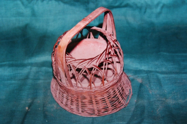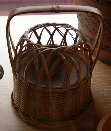 這種攜帶式暖爐,客語稱為火囟,是早期寒冬時節老人家最溫暖實用的取暖提具。一籃在手,去除寒意,又便於攜行。它是用竹篾以輪口編法做為籃口,把紅磚小火盆納包在內,向下疏編至火盆口改以壓一挑一密實編法做底收編,寬竹片提把能提能掛,非常方便。不過,竹篾的編法並非只有一制,還有其他的編結式樣。使用時只要用火鋏把燒紅的火炭放入幾塊,上面灑些灰燼,避免過燙,有很好的熱烘效果。
