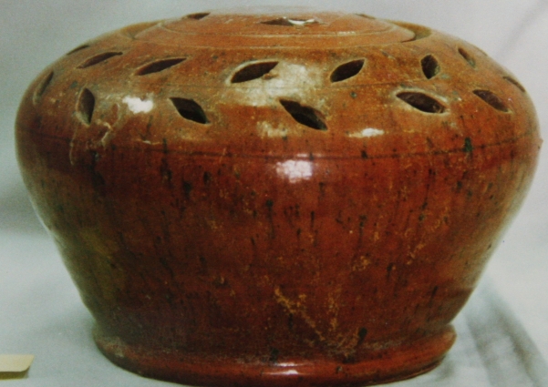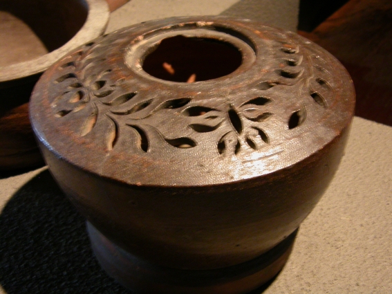 這種火籠為紅土素燒,陶體比攜帶式暖爐的陶火盆大,有多種型制,都具有素樸的美感。最常見的是窄口的陶火籠,上部利用漏空透鑿方法,在延口四周,留出各種形狀如錢紋和花草紋等紋樣的小洞,避免炭火火花飛揚。夜晚時,碳火餘光從這些小洞透出,別有詩意。第二種是形如罐子的陶火籠,上用鐵圈透空做蓋。另外一種是廣口陶火籠,無蓋。使用時也是放入燒紅的火炭,適用於小範圍的烤暖,兼除濕氣,如書桌、臥室或客廳地上等。