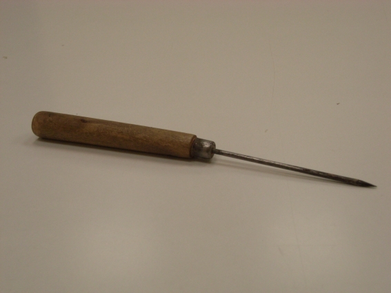 針錐是一種用來定位置、挑撿落毛、配杆劃邊的輔助工具。可用稍大的縫衣針,將針尾插入小木棍做手桿,不容易脫出後即可使用。